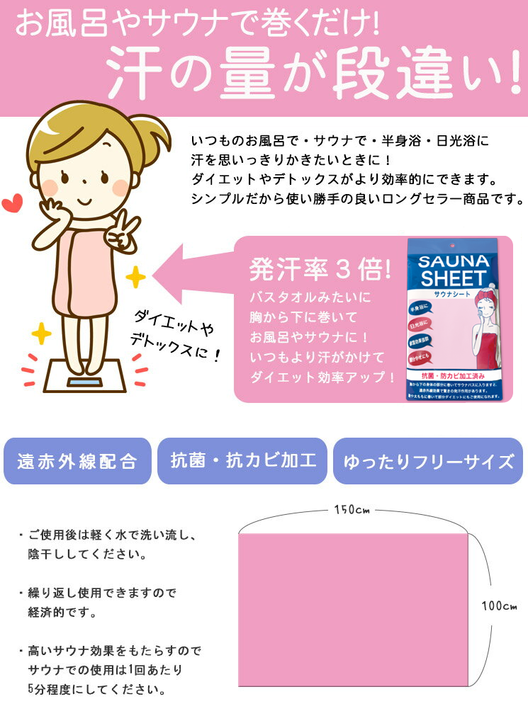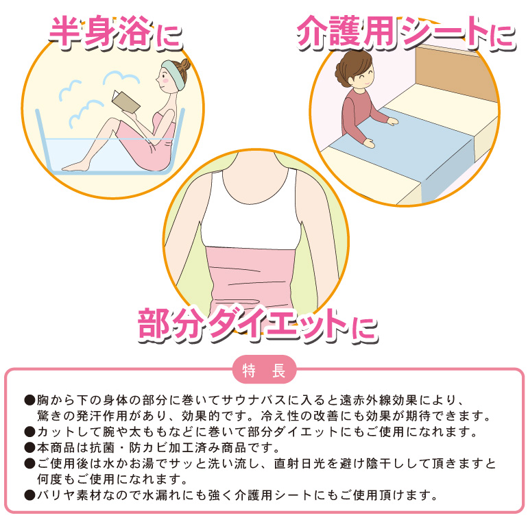 ・バスタオルを巻くようにサウナシートを胸から下の部分に巻いて使用してください。